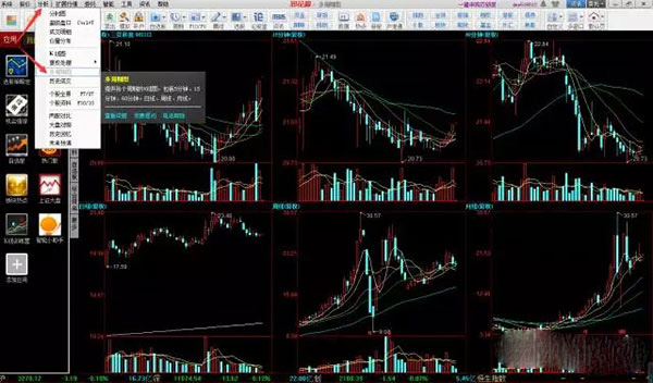点击左上角分析,再选择多周期图,就可以同时看到5分钟、15分钟、60分钟、日线、周线、月线口多个不同周期的技术指标的走势状况,以进行分析。