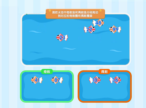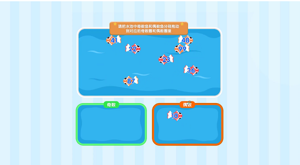 5、提供游戏编程练习,请把水池中奇数鱼和偶数鱼分别拖动到对应的奇数圈和偶数圈里