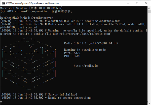 打开cmd窗口,切换到Redis安装路径,输入 redis-server 启动 redis 服务