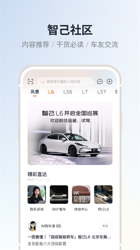 IM智己app官方专为旗下汽车推出的一款提供智能汽车服务的手机端软件,这款软件能够帮助用户提供超多的汽车线上服务,不管用户想要在这里看最新的汽车相关资讯、新的汽车车展活动,还是想要看在线订车、最新资讯、汽车操控连接等其他服务。