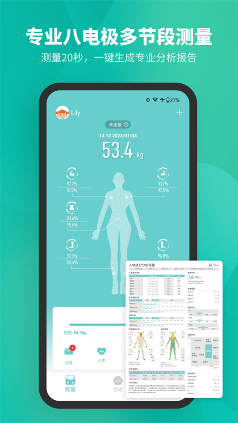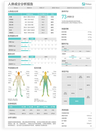借助BIA生物电阻抗技术,仅需20秒时间,即可获知BMI、 体脂率,基础代谢率等多项人体指标,一键生成身体成分专 业分析报告,解析全身,提供专业指标参考。