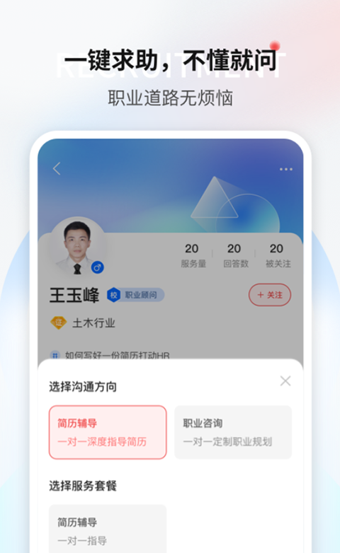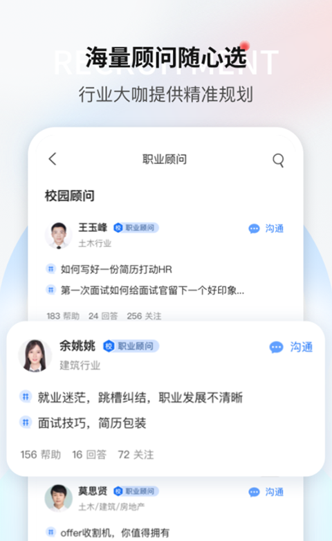【职业顾问】根据个人困惑选择相匹配的顾问,在线获得个性化指导;