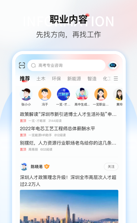 一览职业App是一款求职招聘找工作软件。一览职业App关注职场人职业生涯的全程,为中国职场人提供职业规划、技能学习、职业社交和精准找工作等方面的社区服务,。在应用内您不仅可以向这些业界领袖问道、问技、问惑,提升专业技能、拓宽视野、增长见识。