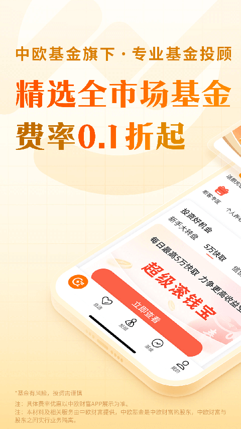 中欧财富app又称中欧钱滚滚,是中欧基金旗下的一款理财交易app软件,提供活期、基金、养老等多种产品,精选超30家基金公司股票基金、混合基金、指数基金、债券基金等理财产品,解决你的选基困难症!中欧财富app还针对不同需求,定制投顾组合策略,帮你快速了解产品和基金管理人。