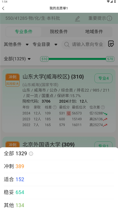 4、进入智能选学点击可查看稳妥、适合、冲刺学校。