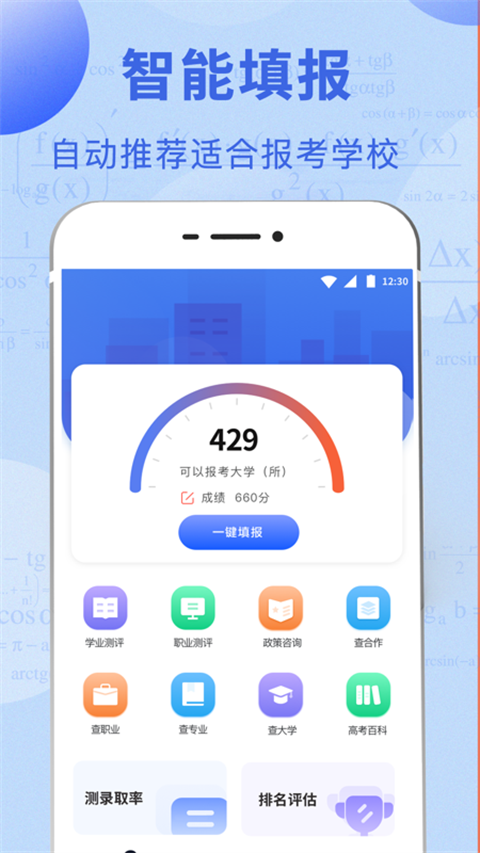 根据考生的个人情况以及报考志愿,自动推荐适合报考学校,提供预估被高校录取的可行性报告和指导。