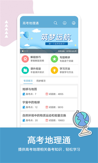 高考地理通中有解题技巧、专题精讲、课外阅读、学习方法等文章不断为你的高考备考加分,而且拥有往年高考真题和模拟题,错题解析,能够帮你提升地理成绩所谓临阵磨刀不快也光,所以想要提升成绩的小伙伴快来本站下载吧!
