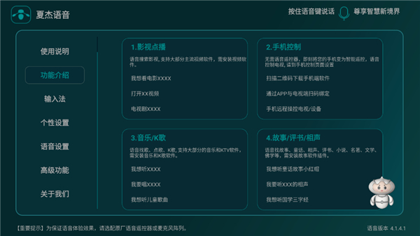 在电视上安装后通过夏杰语音app扫描绑定账号即可使用,通过语音输入设备即可在自动搜索跳转运行,例如想听音乐,只需要说打开QQ音乐播放某某歌曲即可自动打开播放,让你摆脱遥控器!