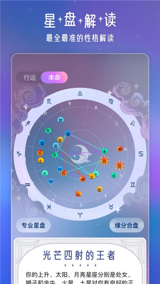 1、星盘解读:精致好看的定制星盘,又全又准的性格解读2、每日运势:推运测算未来运程,桃花财运、一目了然