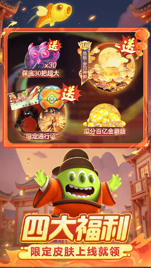 - 派送10亿金蘑菇啦!活动期间,海量金蘑菇每天在线抢,最高6666金蘑菇登录领,还有超大奇妙宝箱钥匙、珍宝箱、爬塔步数等海量道具惊喜掉落!