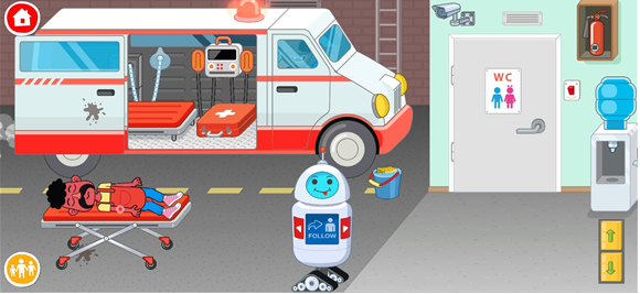 4、随后将救护车拉走,打开电梯将病人送上上面去治疗,点击向往上的按键。