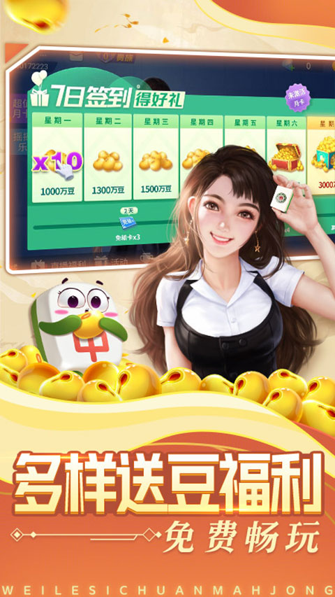 玩法多样,不仅有经典血流血战,一胡到底,免洗8红中,番出天际,刺激不停。还有创新玩法国标免洗,花牌癞子,大胡爽到底。还能疯狂加番刺激再升级!让你全局一爽再爽,快乐得停不下来。游戏福利多多,豪礼不停,登录奖励、签到奖励、升级奖励等海量福利大派送,就等你来拿!