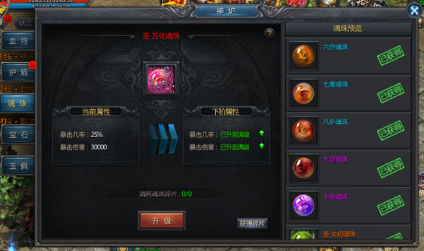 3、魂珠不可以进行强化。点击主界面的神炉系统图标,进入魂珠界面。魂珠分为15个等级,越高等级的魂珠能够提供给佩戴者更高的暴击率与暴击力提升。低等级的魂珠可以消耗一定数目的魂珠碎片进行升级,提升为高一级的魂珠。魂珠碎片可以通过打怪掉落、各种活动、礼包及商城购买等方式获得。传奇大陆当中,魂珠碎片分布稀少,各位勇士可要注意收集,千万不可错过。升级魂珠,获得极大暴击加成,享受秒杀的快感!