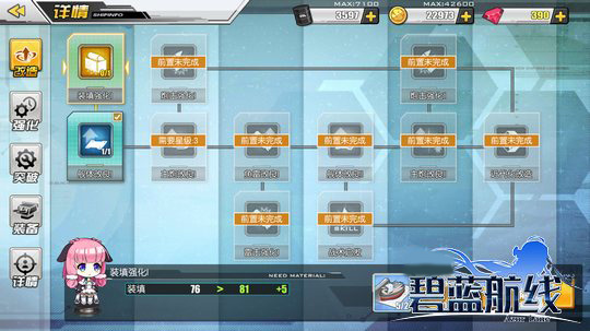 4、每一项属性的改造都需要消耗对应的改造图纸。如小天鹅改造需要消耗驱逐改造图纸,而萨福克则需要巡洋改造图纸。