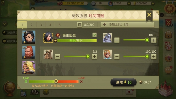 在选择好目标后,玩家要做的就是进攻之前的准备,这里玩家需要搭配好自己的进攻阵容,以及侍从的搭配,尽量使得自己的军团战力高于强盗战力,在准备好后即可对强盗发起进攻。