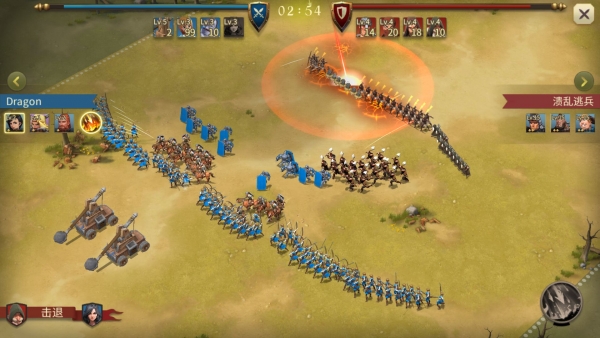 在玩家军队到达目标强盗后,点击战斗标志就会进入到战斗画面,玩家可以在战斗画面中主动释放侍从技能来攻击强盗们。