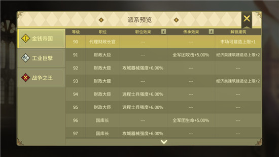 在领主们升级为三级城堡后,可以选择金钱帝国、工业巨擘与战争之王的其中一种,作为日后发展成长的方向。完成派系任务,即可提升派系等级,获得派系赋予的独有加成,并可以扩充相应的建筑数量上限,将会让城市获得巨大增益。