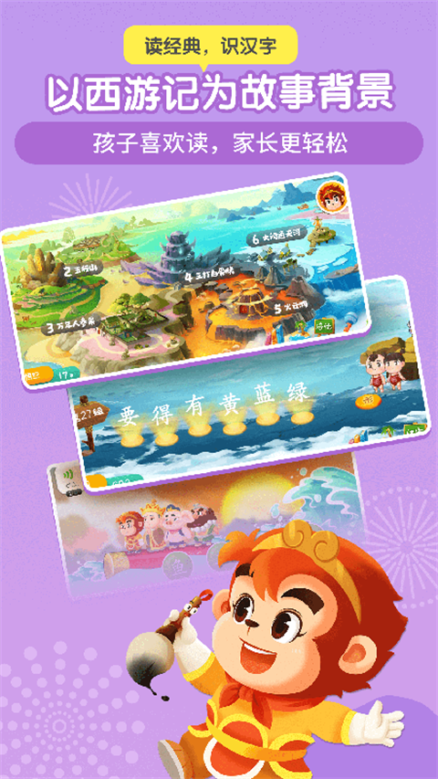 以广受孩子喜爱的经典名著西游记为故事背景,在孩子喜爱西游记的同时,感受国学名著魅力,不知不觉的掌握汉字。