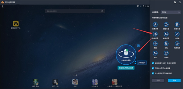 右键视角:拖动右键视角到屏幕,点击保存,设置好之后右键激活,可以用鼠标来控制视角转动。