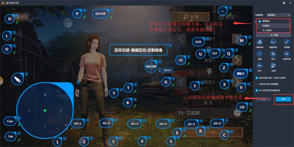 键盘视角(多用于3D动作游戏):拖动键盘视角按键到右半边的屏幕,默认旋转按键为↑↓←→,点击保存,也可以自行配置。