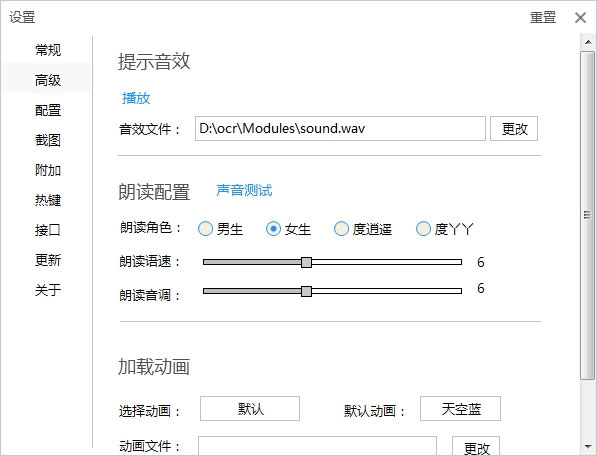 在高级选项卡里,你将能播放音效、朗读的声音(男声或是女声)、朗读的音调与速度快慢等;